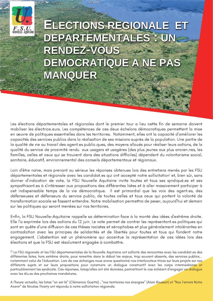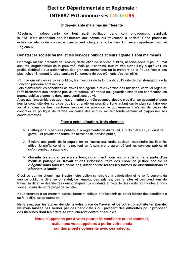 Résolument indépendante de tout parti politique dans son engagement syndical, la FSU n’est cependant pas indifférente aux débats qui traversent la société. Cette prochaine échéance électorale concerne directement chaque agent.e des Conseils départementaux et Régionaux.