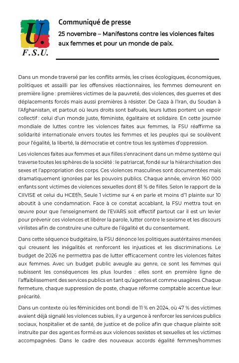 Pour la FSU, le 25 novembre n’est pas un jour symbolique, mais une journée de lutte et de mobilisation mondiale : celle des femmes unies pour mettre fin à toutes les formes de violences sexistes et sexuelles.