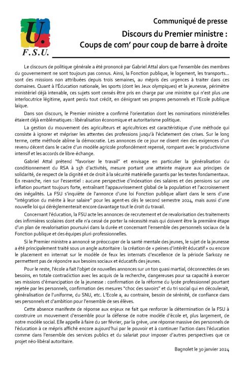La FSU Territoriale, réunie en Bureau délibératif ces 1er et 2 février 2024, manifeste son soutien