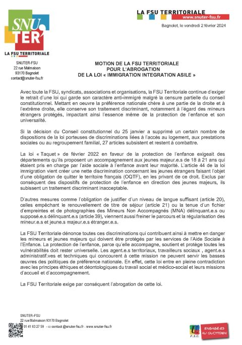MOTION DE LA FSU TERRITORIALE POUR L’ABROGATION DE LA LOI « IMMIGRATION INTEGRATION ASILE »