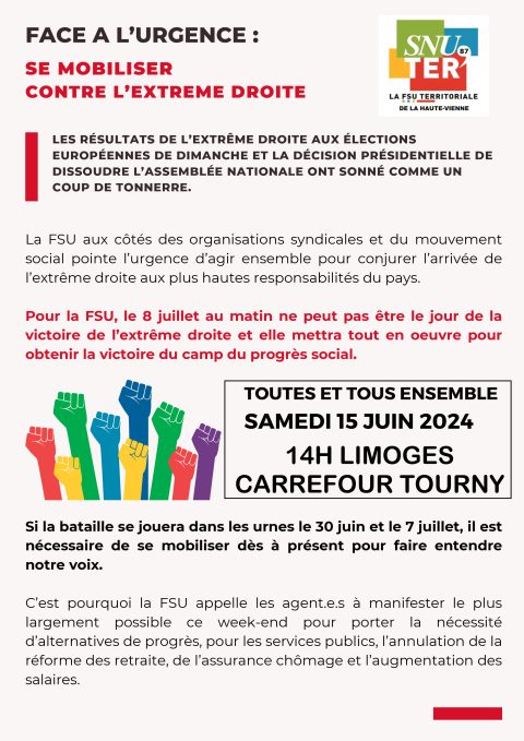 Mobilisation contre l’extrême-droite : Manifestation Samedi 15 juin 2024 à LIMOGES – 14h – Carrefour TOURNY