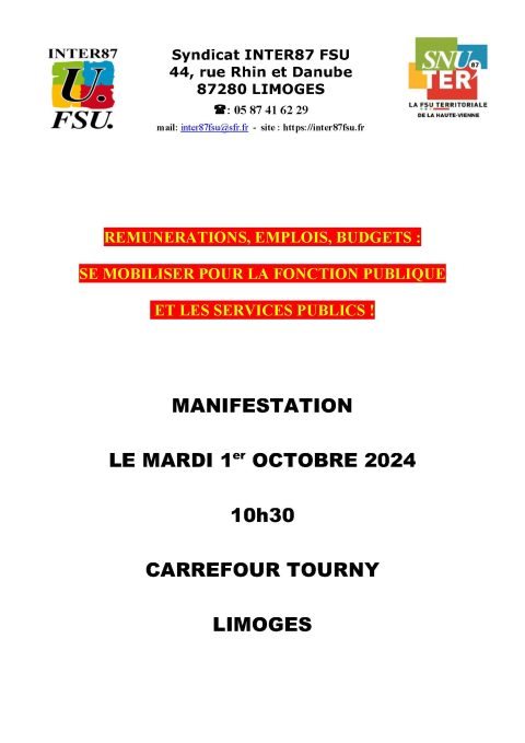 Manifestation le mardi 1er octobre à LIMOGES – 10h30 – Carrefour TOURNY
