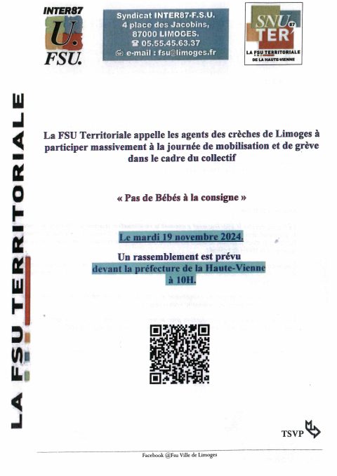 La FSU territoriale appelle les agents des crèches de Limoges à participer massivement à la journée de mobilisation et de grève dans le cadre du collectif « Pas de bébés à la consigne » ce mardi 19 novembre 2024.
