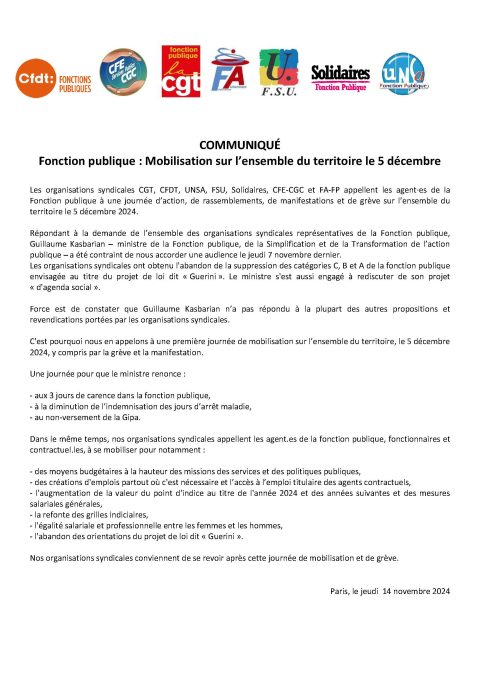 COMMUNIQUÉ INTERSYNDICAL – Fonction publique : Mobilisation sur l’ensemble du territoire le 5 décembre