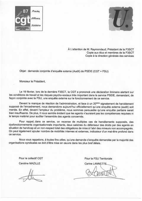 Demande conjointe d’enquête externe (Audit) de PSEIE (CGT+ FSU)