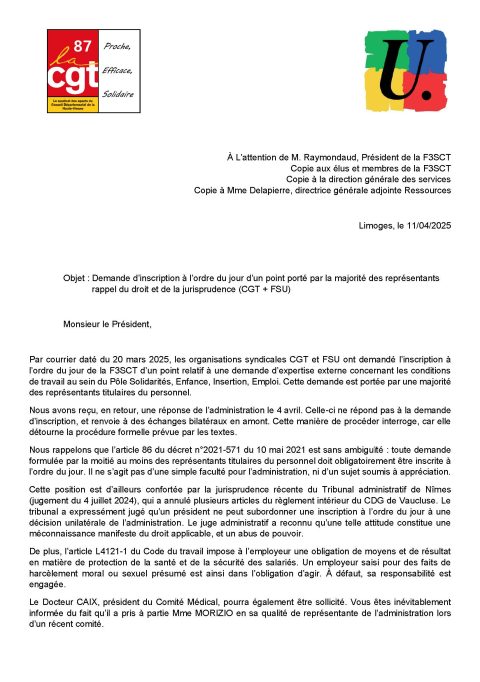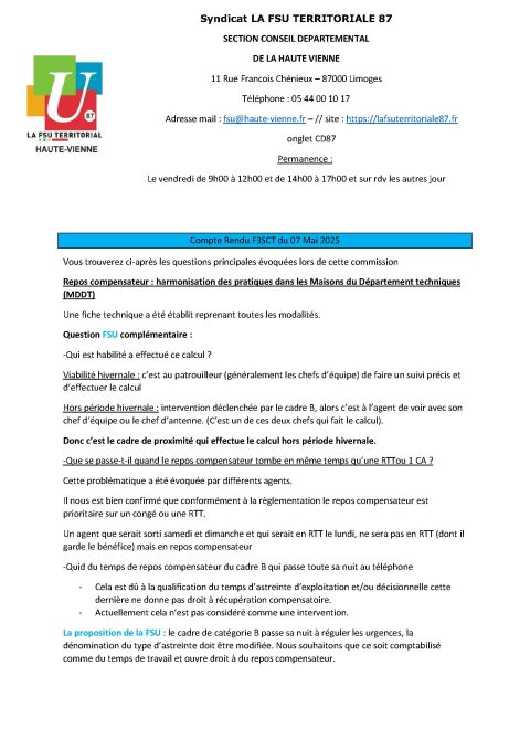 Conseil Départemental 87 : Compte Rendu F3SCT du 07 Mai 2025