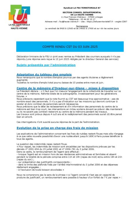 Conseil Départemental 87 : COMPTE RENDU DU CST DU 03 JUIN 2025