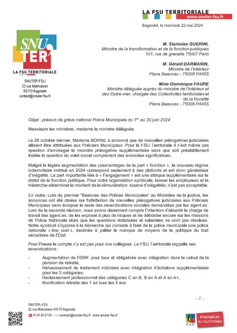 Préavis de grève national Police Municipale du 1er au 30 juin 2024