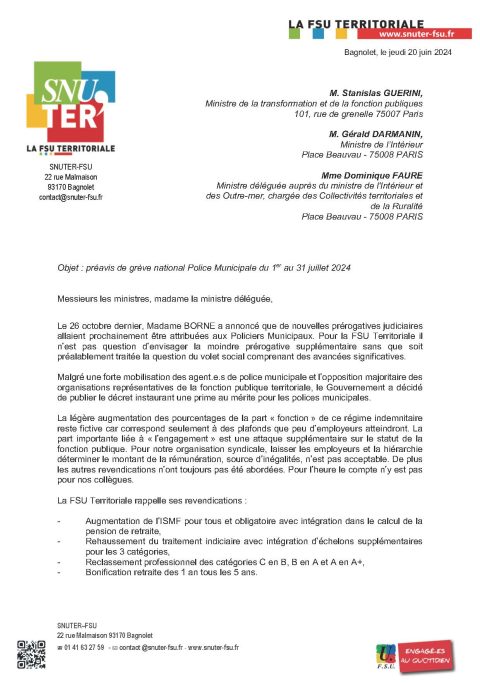 Préavis de grève national Police Municipale du 1er au 31 juillet 2024