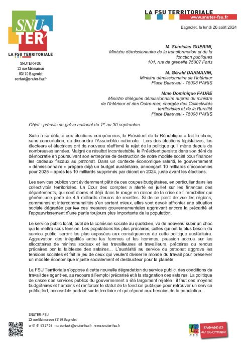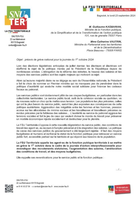 Préavis de grève national pour la journée du 1er octobre 2024