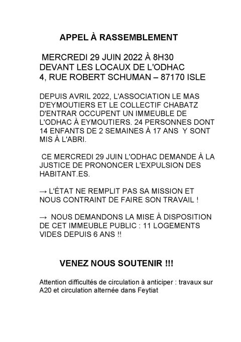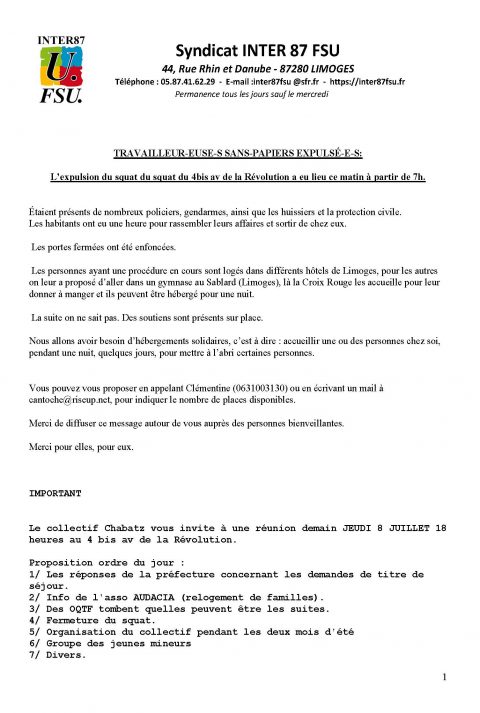 CHABATZ D’ENTRAR : URGENT expulsion des travailleurs sans papiers du 4 bis avenue de la Révolution à Limoges !! MOBILISATION A 18H30 DEVANT LA PREFECTURE DE LIMOGES