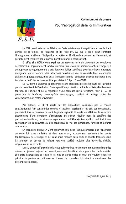 Communiqué de Presse FSU pour l’abrogation de la loi immigration