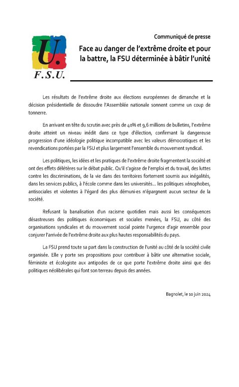 Communiqué de presse : Face au danger de l’extrême droite et pour la battre, la FSU déterminée à bâtir l’unité