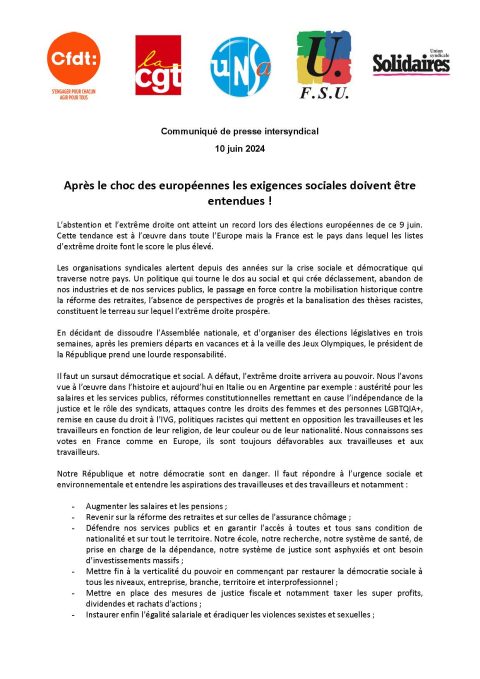 Communiqué de presse intersyndical : 10 juin 2024 – Après le choc des européennes les exigences sociales doivent être entendues !