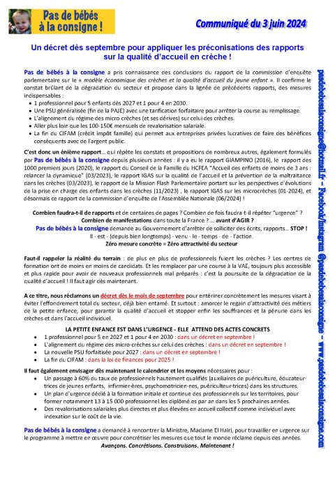 Nous réclamons un décret dès le mois de septembre pour entériner concrètement les mesures visant à éviter l’effondrement total du secteur, déjà bien entamé. Et surtout : amorcer le regain d’attractivité des métiers de la petite enfance, pour garantir la qualité d’accueil et stopper enfin les souffrances et la pénurie dans les crèches et dans l’accueil individuel.