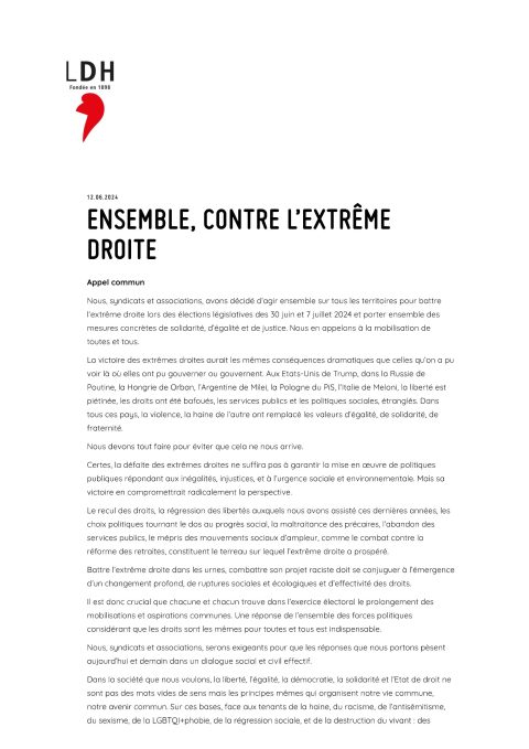 Nous, syndicats et associations, avons décidé d’agir ensemble sur tous les territoires pour battre l‘extrême droite lors des élections législatives des 30 juin et 7 juillet 2024 et porter ensemble des mesures concrètes de solidarité, d’égalité et de justice. Nous en appelons à la mobilisation de toutes et tous.