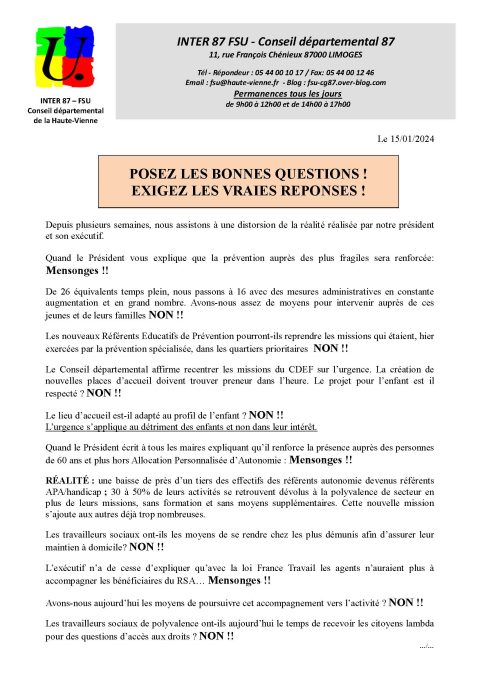 Mouvement social Le mardi 23 janvier 2024 au Conseil Départemental de la Haute-Vienne