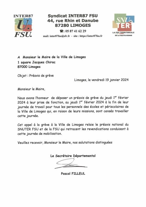 Préavis de de grève à la Ville de LIMOGES le 1er Février 2024