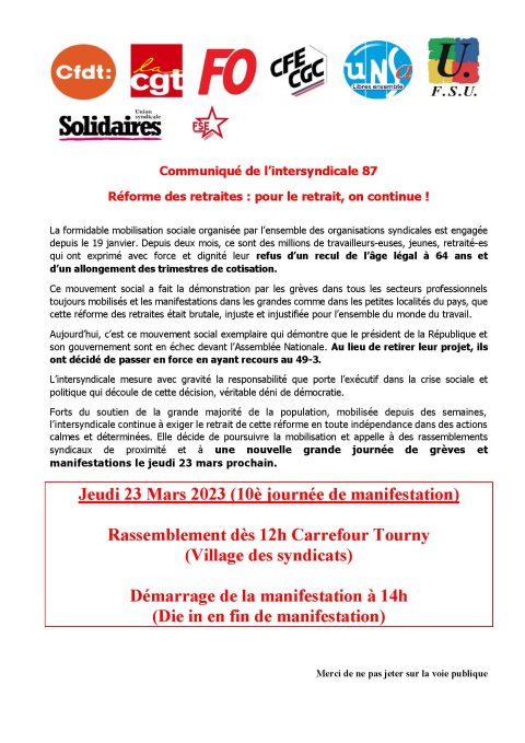 LIMOGES – Carrefour TOURNY à partir de 12 h (village syndical pour casse-croûte) et départ du cortège à partir de 14 h, même parcours.