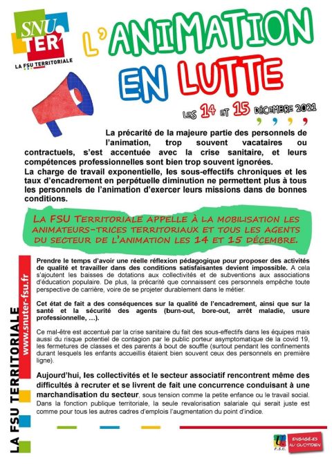 La FSU territoriale appelle à la mobilisation les animatrices et animateurs territoriaux et tous les agents du secteur de l’animation les 14 et 15 Décembre 2021. Télécharger le document : https://lafsuterritoriale87.fr/wp-content/uploads/2021/12/Tract-animation-Word.pdf
