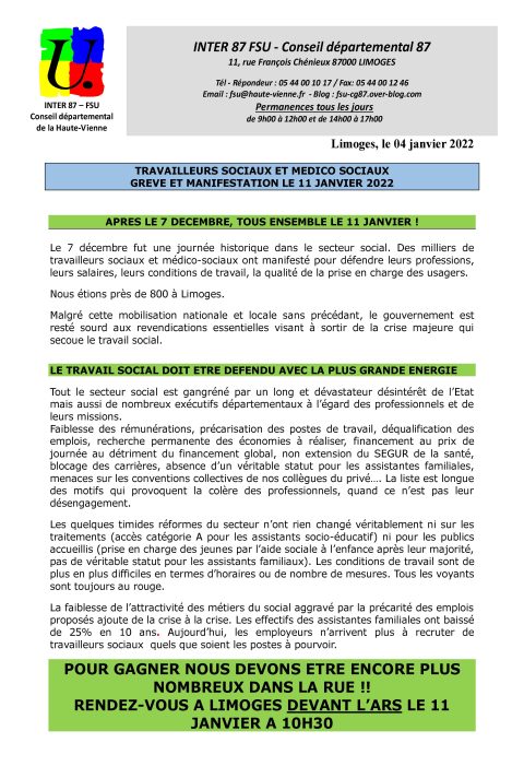 TRAVAILLEURS SOCIAUX ET MÉDICO SOCIAUX : GRÈVE ET MANIFESTATION LE 11 JANVIER 2022 à LIMOGES
