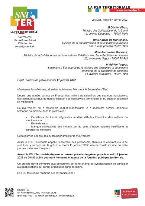 Préavis SNUTER pour le 11 janvier (travail social) et le 13 janvier (situation sanitaire dans les écoles)